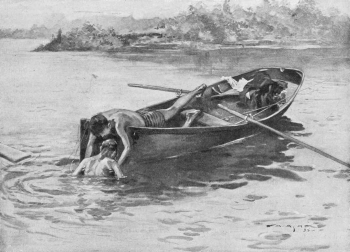 Ages and ages seemed to pass as Ned, shivering and pale, strained his eyes to see the block of wood appear again. Suddenly he caught a glimpse of the bit of wood slowly rising close by the side of the boat, and below it, as it came up zigzagging to the surface, he saw the white body following. It was a lucky thing that a stout trolling-line had been used in the scheme, for Ned reached far over the gunwale and firmly seized the line, then gently and steadily pulled the heavy weight to the surface. There were no signs of life in Joe's limp body; his cramped hand held the line twisted about his fingers, his eyes were closed, and his mouth half open.