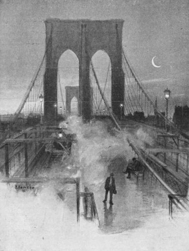 For nearly five years I have been going over the Brooklyn Bridge night and day, and it seems to me that every few days I see something in the arrangement of the details of the structure that I never saw before. It is a constant delight to watch the bridge under the varying conditions that affect it from day to day. One can see, for example, how carefully the wires for the electric lights are strung. They are almost within reach of any person walking across the structure, and yet there is absolutely no danger from them. It is interesting to watch the bracing of the structure, how the big and little stays slope now this way and that, and to note just where they change in their slanting direction. It is also interesting at the dead of night to see the workmen splice one of the car cables, taking out some broken strand and weaving in another.