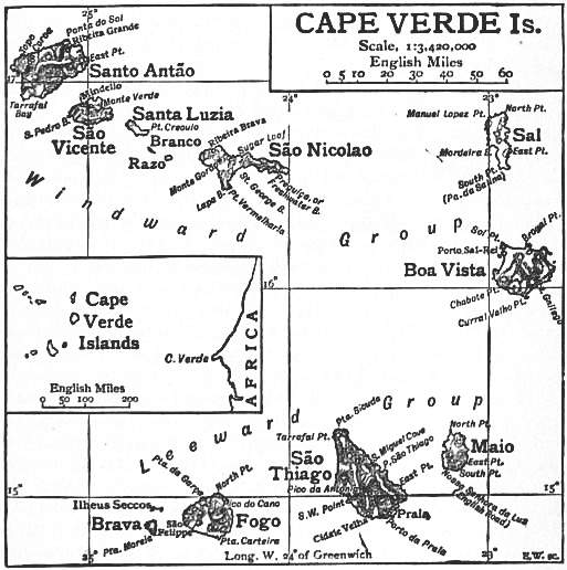 CAPE VERDE ISLANDS (Ilhas do Caba Verde), an archipelago belonging to Portugal; off the West African coast, between 17° 13′ and 14° 47′ N. and 22° 40′ and 25° 22′ W. Pop. (1905) about 138,620; area, 1475 sq. m. The archipelago consists of ten islands:—Santo Antão (commonly miswritten St Antonio), São Vicente, Santa Luzia, São Nicolao, Sal, Boa Vista, Maio, São Thiago (the St Jago of the English), Fogo, and Brava, besides four uninhabited islets. It forms a sort of broken crescent, with the concavity towards the west. The last four islands constitute the leeward (Sotavento) group and the other six the windward (Barlavento). The distance between the coast of Africa and the nearest island (Boa Vista) is about 300 m. The islands derive their name, frequently but erroneously written “Cape Verd,” or “Cape de Verd” Islands, from the African promontory off which they lie, known as Cape Verde, or the Green Cape. The entire archipelago is of volcanic origin, and on the island of Fogo there is an active volcano. No serious eruption has taken place since 1680, and the craters from which the streams of basalt issued have lost their outline.