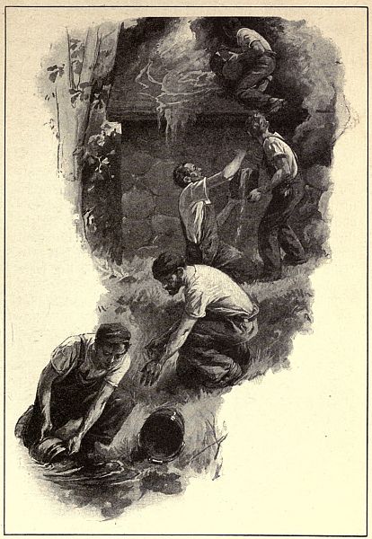 "I looked around for Boney; and at first I didn't see him. I thought he'd gone down sure, and so he had; but just as I was looking I saw a big black thing heave up through the ice, and I heard a queer cry. Well, that was Providence, sure! It seems the engine had ripped her cab clean off as she tore through the ice, and here was the cab coming up bottom side first, with Boney inside hanging on to a brace and almost dead. I hauled him out, and then we scrambled ashore over the wrecked cars. They were full of flour, and[417] the barrels were all busted open, so by the time we reached the bank we looked like a twin Santa Claus made of paste, and three quarters drowned at that."