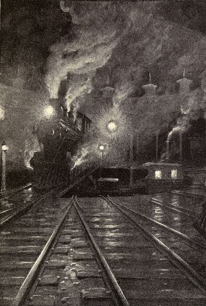 "That was 'way back in '69," said the other, "when I was firing for 'Boney' Cassin, the brother of Denny. It was in winter, a bitter cold day, and the Hudson was so gorged with ice that part of the jam had squeezed over the bank and torn away our tracks. So pretty soon, when we came along with twenty-three cars of a train of merchandise, why in we went, and the old engine 'Troy' just skated ahead on her side into the river, smash through the ice, down to the bottom, and pulled thirteen cars after her.