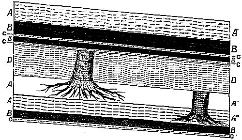 Fig. 2.—Section showing coal seams and upright trunks attached to roots in situ. A′, A″, A′″, beds of shale. B, coal seams. C, underclay. D, sandstone.