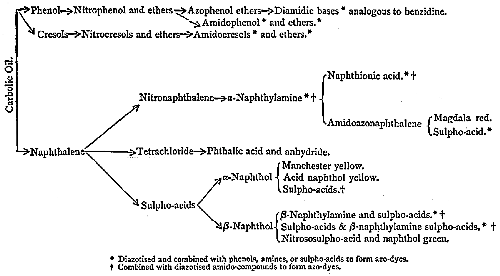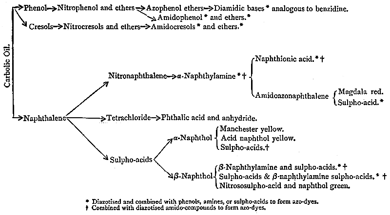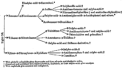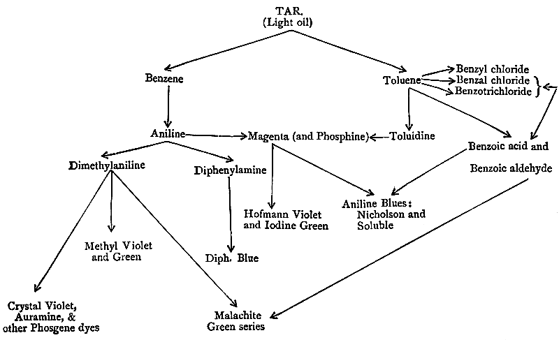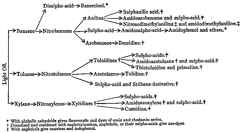 [7] In one large factory in Yorkshire there is a set of stills kept constantly at work making pure aniline at the rate of two hundred tons per month. The monthly consumption of coal in this factory is two thousand tons, equal to twenty-four thousand tons per annum.