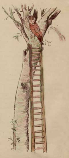 And sure enough there "he" was, and just exactly as Nora had described him. A tiny dark-brown creature, like a wee old man, with a little red jacket, and a small red skull-cap on the top of his head. He seemed to have come up suddenly from among the bushes; he was holding the branch of a blackberry tree in one hand, and with the other greedily plucking and eating the fruit as fast as he could.