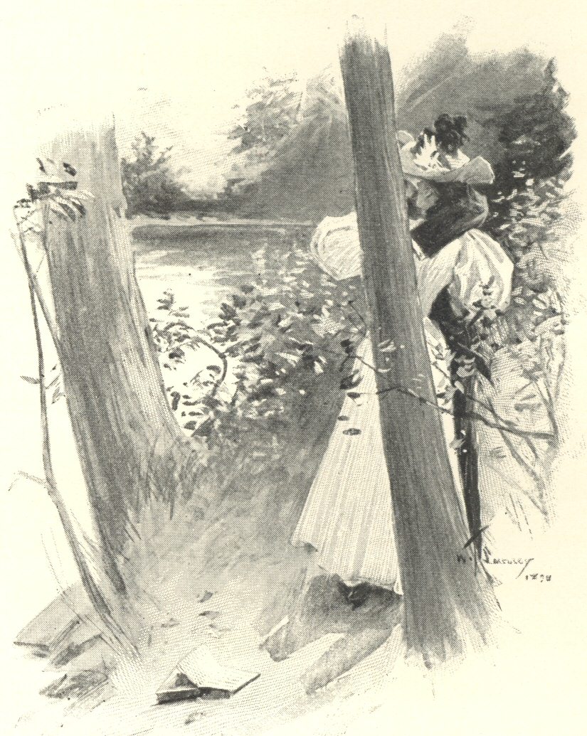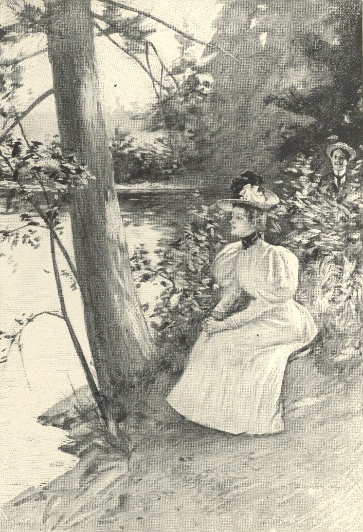 Finally, I found it necessary to act myself. I could not stand the sight of Harley being gradually eaten up by the longing of his own soul, and I tried my hand at exploration. I had no better success for several weeks; and then, like an inspiration, the whole thing came to p. 220me. “She won’t come when he summons her, because she loves him. She won’t summon him to come to her, for the same reason. Why not summon both of them yourself to a common ground? Embalm them in a little romance of your own. Force them if need be, but get them there, and so bring them together, and let them work out their own happiness,” said I to myself. The only difficulty that presented itself was as to whether or not Marguerite would allow herself to be forced. It was worth the trial, however, and fortune favored me. I found her far from rebellious. My pen had hardly touched paper when she materialized, more bewilderingly beautiful than ever. I laid the scene of my little essay at Lake-wood, and I found her sitting down by p. 221the water, dreamily gazing out over the lake. In her lap was Stuart Harley’s book, and daintily pasted on the fly-leaf of this was the portrait which had appeared in the August issue of The Literary Man, which she had cut out and preserved.
