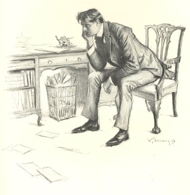 Harley didn’t exactly see how his fortune was going to be made on the p. 18best terms of Messrs. Herring, Beemer, & Chadwick, even if he hit the girls with all the force of a battering-ram, but he promised to keep the idea in mind, and remained in his trance a trifle longer than might otherwise have been necessary, endeavoring to select the unquestionably correct hero for his story, and Osborne was the result. Osborne was moderately witty. His repartee smacked somewhat of the refined comic paper—that is to say, it was smart and cynical, and not always suited to the picture; but it wasn’t vulgar or dull, and his personal appearance was calculated to arouse the liveliest interest. He was clean shaven and clean cut. He looked more like a modern ideal of infallible genius than Byron, and had probably played football and the banjo in college—p. 19Harley did not go back that far with him—all of which, it must be admitted, was pretty well calculated to assure the fulfilment of Harley’s promise that the man should please the American girl. Of course the story was provided with a villain also, but he was a villain of a mild type. Mild villany was an essential part of Harley’s literary creed, and this particular person was not conceived in heresy. His name was to have been Horace Balderstone, and with him Harley intended to introduce a lively satire on the employment, by certain contemporary writers, of the supernatural to produce dramatic effects. Balderstone was of course to be the rival of Osborne. In this respect Harley was commonplace; to his mind the villain always had to be the rival of the hero, p. 20just as in opera the tenor is always virtuous at heart if not otherwise, and the baritone a scoundrel, which in real life is not an invariable rule by any means. Indeed, there have been many instances in real life where the villain and the hero have been on excellent terms, and to the great benefit of the hero too. But in this case Balderstone was to follow in the rut, and become the rival of Osborne for the hand of Marguerite Andrews—the heroine. Balderstone was to write a book, which for a time should so fascinate Miss Andrews that she would be blind to the desirability of Osborne as a husband-elect; a book full of the weird and thrilling, dealing with theosophy and spiritualism, and all other “Tommyrotisms,” as Harley called them, all of p. 21which, of course, was to be the making and the undoing of Balderstone; for equally of course, in the end, he would become crazed by the use of opium—the inevitable end of writers of that stamp. Osborne would rescue Marguerite from his fatal influence, and the last chapter would end with Marguerite lying pale and wan upon her sick-bed, recovering from the mental prostration which the influence over hers of a mind like Balderstone’s was sure to produce, holding Osborne’s hand in hers, and “smiling a sweet recognition at the lover to whose virtues she had so long been blind.” Osborne would murmur, “At last!” and the book would close with a “first kiss,” followed closely by six or eight pages of advertisements of other publications of Messrs. Herring, p. 22Beemer, & Chadwick. I mention the latter to show how thoroughly realistic Harley was. He thought out his books so truly and so fully before he sat down to write them that he seemed to see each written, printed, made and bound before him, a concrete thing from cover to cover.