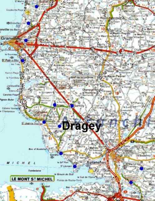 116. Dragey. Location. The village of Dragey is located on the current coastal road going from Granville to Avranches, 20 kilometers south of Granville and 13 kilometers north of Avranches. Dragey was on the route of three medieval roads, the first one coming from Saint-Pair-sur-Mer, the second one coming from Coutances and the third one coming from Saint-Lô. The shore road coming from Saint-Pair was crossing the dunes of Dragey before reaching Mont Saint-Michel, the final destination for many pilgrims.