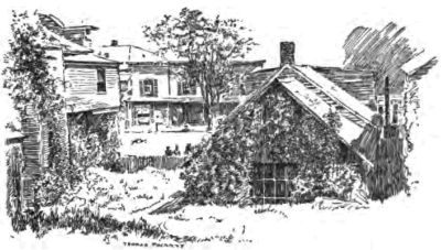 Like most things or people really worth knowing, the printing-office is of a retiring disposition. It is an old building, once a dwelling-house, which stands somewhat back[Pg 12] from the street, with a quaint old garden around it. An ancient picket fence, nicked and whittled by a generation or so of boys who should have known better, guards its privacy. At the tip of the low cornice is a weatherbeaten bird house, a miniature Greek Parthenon, where the wrens built their nests. Larger and more progressive business buildings had crowded up to the street lines on both sides of it, and yet it managed to preserve somehow an air of ancient gentility. The gate sagged on its hinges, the chimney had lost a brick or two, but it sat there in its garden and watched with mild interest the hasty world go by.
