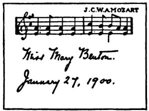 Lay the table very much as for the New Year's day luncheon, with red flowers, candles, and other decoration, and if you wish to emphasise the national colours of Germany, Mozart's home, have red and chocolate bonbons on the table and give each guest a little knot of red and white carnations tied with black ribbons. For cards, go to the printer and have him strike off small cuts of Mozart's head on squares of cardboard; all printers have cuts of distinguished people, and they can be reproduced for about a dollar a dozen. Just under the cut draw in pen and ink a bar of music from one of the composer's works with his name attached in tiny letters.