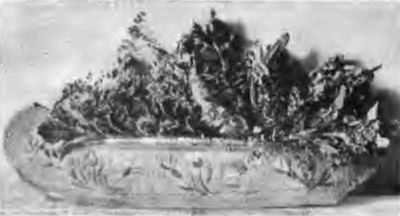 A long, narrow pan of water stood on an oblong table, the outside completely hidden by small, growing ferns, planted in moss. In the centre of the pan was a miniature rockery, a pile of stones the size of one's fist, with these same ferns planted in all the crevices. But the charming thing was a little flock of china ducks, geese, swans, and tiny yellow goslings which floated on the surface of this small lake, moving somewhat as the table was stirred more or less by the restless guests. This arrangement for a children's party would be irresistible.[Pg 35]