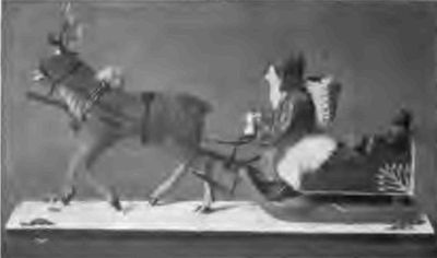 After the final course a sleigh filled with candies may be brought in, with Santa Claus driving his team of reindeer, and this may be placed in state on one end of the table, or, if the little tree is not to be had for the central decoration, this toy may take its place, and stand in the centre all through the meal.