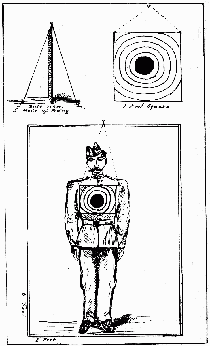 To those who do not possess a regulation iron target, I would recommend one similar to that which I have sometimes used. (Vide diagram.) This target is made of a simple framework of wood, covered with canvas and layers of paper pasted thereon. It has the double advantage of having the Martini-Smith[37] target in the centre, and the remaining portion, having the exact size of a man traced thereon, has one other advantage in at once showing the result of the practice. This target can be used over and over again, as, after use, the perforations can be pasted over with small pieces of paper, and when well riddled, it can be re-covered; and the thicker it becomes the better.
