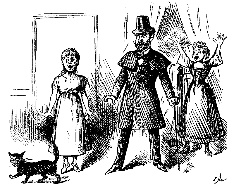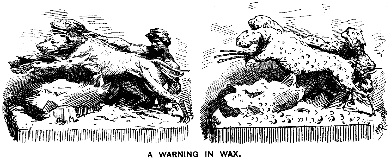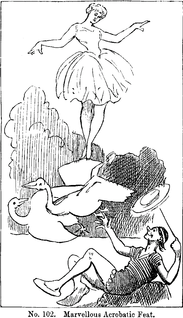 The Marsh King's Daughter. One of Warne & Co.'s publications for children's amusement, but the illustrations by Jessie Currie are too highly curried, or rather coloured, and the effect is hard and theatrical. By the way, Miss Currie's genius is a trifle wilful; for example, take this situation, which she has chosen to illustrate,—"She ... pointed to a horse. He mounted upon it, and she sprang before him, and held tightly by the mane." Now, asks the Baron, taking for granted the "sprang" is for "sprang up," how would ordinary talent depict this scene? Why, certainly, by showing the girl mounted on the horse, holding on by the mane in front of the man, and the man up behind. Not so Miss Currie. She puts the good man—apparently an Amateur Monk—astride the horse, and she riding behind, holding lightly as it appears, with one hand the broad red crupper, and, with the other, probably, some portion of the Amateur Monk's dressing-gown. But genius must not be fettered.