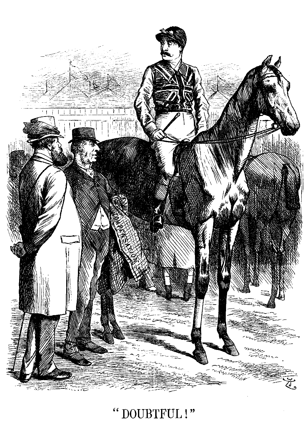 There are many horses in for the Derby. Some people fancy Surefoot. Fancies are not, of course, facts, but the name is good. Keep your eye on the black and cerise of Liddiard. Sainfoin is not generally supposed to cover grass, but there are generally exceptions. I have not heard the angels calling Le Nord lately, but they may begin at any time. A man may get home, so may a horse, and I am bound to say that if I were The Beggar I should give the lie to the crack-brained puddling proverb, and be a chooser of first place. Bel Demonio should be all there when the first part of his name rings, so that he may go like the second, if he wants to be one, two, or three. Rathbeal rhymes to heel. Has he got a clean pair to show? Orwell should score well; and you must never, tie your Garter too tightly, unless you want to stop your circulation. Golden Gate is not always as open as might be wished; and The Imp is sometimes a hindrance. Good old Polonius! As for Kirkham, Alloway, Martagon, and Loup, all I can say is, Mum's the word. How about the Field? Monkeys are often made there. So much for the Derby.