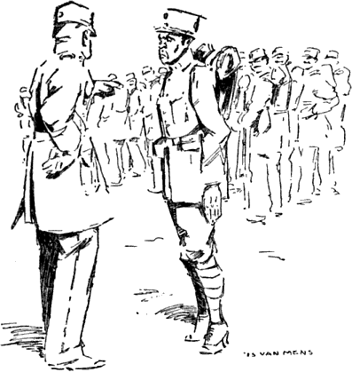 Maar een soldaat, die officier wordt, kan zich, waar het dienstbelangen treft, nog slechts met een ernstig gebaar tot zijne collega's wenden.