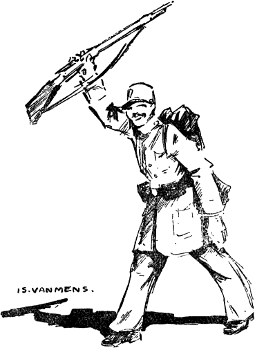 De officier stond op eene kleine verhevenheid, en overzag vandaar het terrein; hij rookte een cigarette, en heel zijn houding drukte rust, doch tegelijkertijd latente macht uit. Hij scheen er zich niet van bewust, dat Gerrit en ik en wellicht nog vele anderen, naar hem keken.