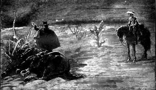 With fresh, strong animals, and without that terrible choking thirst, that night ride over the moonlight plain would have been a rare pleasure. Under the circumstances it was like a frightful dream. Neither of the riders cared to talk; the effort was too painful; but both thought of the last ride they had taken together in the cab of a locomotive on a Missouri railroad, and the man looked tenderly at the boy, as he recalled the incidents of that night. For an hour they rode in silence, their panting steeds maintaining a shambling gait through the sand, that was neither a trot nor a lope, but a mixture of the two. Then they dropped into a walk, and, for another hour, were only roused to greater speed by infinite exertions on the part of their riders. At last Señor stumbled heavily, recovered himself, and then fell.