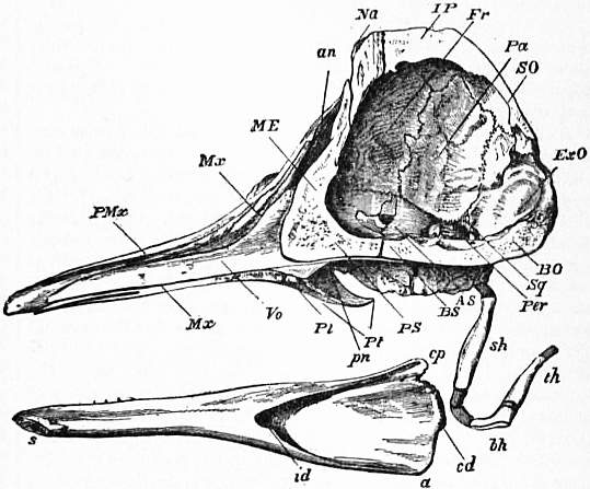 In the skull, the brain-case is short, broad and high, almost spherical, in fact (fig. 1). The supra-occipital bone rises upwards and forwards from the foramen magnum, to meet the frontals at the vertex, completely excluding the parietals from the upper region; and the frontals are expanded laterally to form the roof of the orbits. The nasal aperture opens upwards, and has in front of it a more or less horizontally prolonged beak, formed of the maxillae, premaxillae, vomer, and mesethmoid cartilage, extending forwards to form the upper jaw or roof of the mouth.