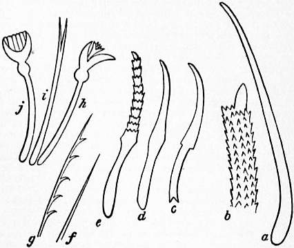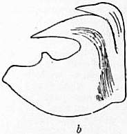 When in the foetal state these whales have numerous minute teeth lying in the dental groove of both upper and lower jaws. They are best developed about the middle of foetal life, after which they are absorbed, and no trace of them remains at the time of birth. The whalebone does not make its appearance until after birth; and consists of a series of flattened horny plates, between three and four hundred in number, on each side of the palate, with a bare interval along the middle line. The plates are placed transversely to the long axis of the palate, with short intervals between them. Each plate or blade is somewhat triangular in form, with the base 771 attached to the palate and the apex hanging downwards. The outer edge of the blade is hard and smooth, but the inner edge and apex fray out into long bristly fibres, so that the roof of the whale’s mouth looks as if covered with hair, as described by Aristotle. At the inner edge of each principal blade are two or three much smaller or subsidiary blades. The principal blades are longest near the middle of the series, and gradually diminish towards the front and back of the mouth. The horny plates grow from a fibrous and vascular matrix, which covers the palatal surface of the maxillae, and sends out plate-like processes, one of which penetrates the base of each blade. Moreover, the free edges of these processes are covered with long vascular thread-like papillae, one of which forms the central axis of each of the hair-like fibres mainly composing the blade. A transverse section of fresh whalebone shows that it is made up of numbers of these soft vascular papillae, circular in outline, and surrounded by concentrically arranged epidermic cells, the whole bound together by other epidermic cells, that constitute the smooth (so-called “enamel”) surface of the blade, which, disintegrating at the free edge, allows the individual fibres to become loose and assume a hair-like appearance.