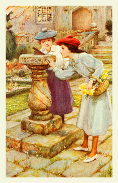 I had not been over an untenanted home before, so I jumped at the opportunity, and we climbed up the hill-side again to a little iron gate which opened through the hedge from the fields. We found ourselves in an old-world garden such as I had never even imagined. The tall yew hedges had been clipped smooth, with here and there a small window cut in them through which the distant landscape appeared like a picture set in a frame. At either end the trees were fashioned into quaint shapes—peacocks with spreading tails, cocked hats, or ramping lions, all getting a little straggling and untended, but adding a very picturesque feature to the scene. There was a long flagged terrace, with dandelions pushing up between the stones, and roses, grown almost wild, climbing in glorious profusion over the balustrade, while a flight of steps led down to the ladies' pleasaunce, where the narrow grass walks were bordered with box-edgings, and pink daisies and forget-me-nots were trying to struggle through the weeds in the neglected beds. In the centre was a sun-dial with twisted shaft, and an inscription round the capital. We rubbed away the moss which[194] covered the worn letters, and spelt out the words, written in old English characters: