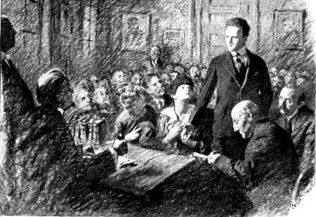 A sudden, instantaneous, electric buzz, a murmur, ran all around the square. A sound of shuffling feet and falling boxes might have been heard as men here and there rose eagerly, their necks craned out toward this swiftly made arena.