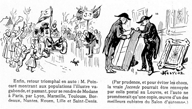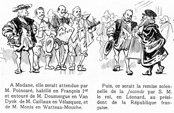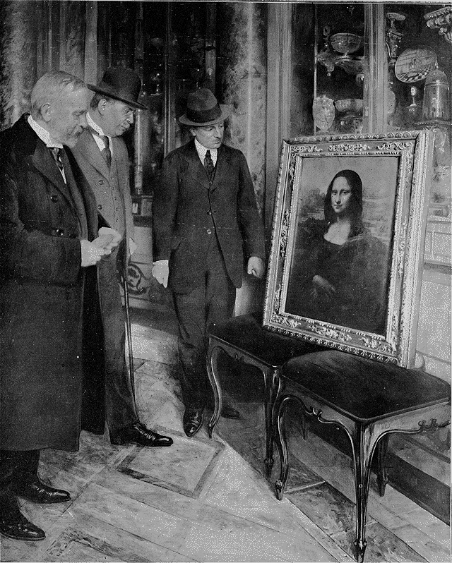 La Joconde, parée d'un cadre ancien, fut disposée sur un chevalet drapé de velours grenat. Une barrière improvisée, formée de lourdes banquettes sculptées, fut disposée en avant, pour la défendre contre d'irrespectueux contacts. Des policiers veillèrent alentour, mêlés aux gardiens. Le public impatient fut enfin introduit, et, dans la seule journée de dimanche, plus de 30.000 personnes purent contempler l'énigmatique regard des yeux bruns, le divin sourire des lèvres décolorées de Monna Lisa.
