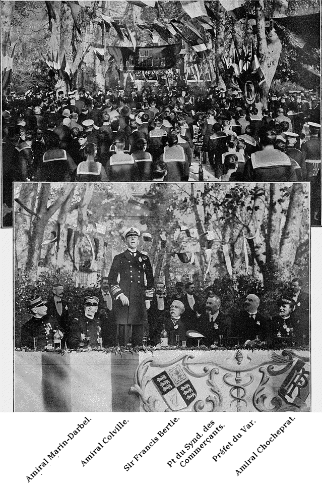 La première escadre de la Home Fleet, commandée par l'amiral Stanley Colville, vient--après s'être rencontrée, à la fin du mois dernier, en vue des côtes grecques, avec la première escadre française--de faire un bref séjour, du 13 au 16 décembre, dans les eaux de Toulon. Ce furent trois journées de fêtes, qui permirent aux marines des deux nations d'échanger les témoignages de la plus cordiale fraternité d'armes: elle eut maintes occasions de se manifester, soit aux réceptions organisées à bord du Collingwood, soit aux dîners offerts à nos hôtes par l'amiral Chocheprat à la préfecture maritime et par l'amiral Marin-Darbel sur le cuirassé Patrie. Nos photographies évoquent ici l'un des épisodes les plus réussis de ces fêtes. Le 15 décembre, dans la matinée, les états-majors et les équipages des navires anglais étaient invités par le Syndicat des Commerçants toulonnais à un vin d'honneur, qui fut servi dans le jardin de la ville, brillamment décoré pour la circonstance: après des toasts portés successivement par M. Hudelo, préfet du Var, et sir Francis Bertie, ambassadeur de la Grande-Bretagne, l'amiral Colville, en manière de remerciement pour l'accueil qui lui avait été fait, convia ses marins à pousser, en notre honneur, trois chaleureux hourras.