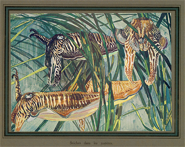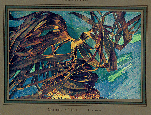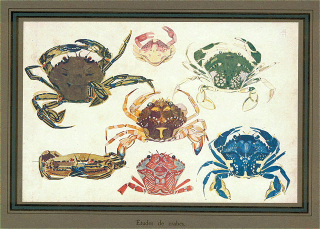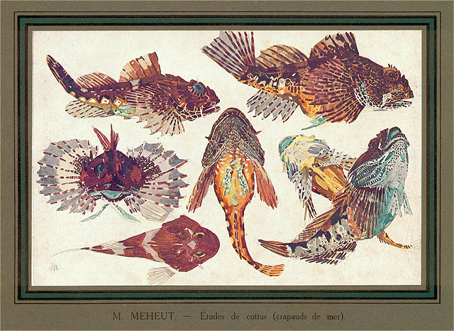 Mais, surtout, ce qui domine cette exposition, la note nouvelle, imprévue et singulièrement attrayante qu'elle nous apporte, et par où s'affirme une personnalité profondément sympathique, c'est cette suite d'études, aquarelles, gouaches, cursives esquisses au pinceau, alertes ébauches ayant le mouvement, l'inattendu, la vérité même du cliché photographique--ou mieux, de ces prestigieux croquis japonais où l'exactitude de la ligne se rehausse de ce quelque chose d'indéfinissable et d'irrésistible qu'est le style--dans lesquelles M. Mathurin Méheut a évoqué la faune et la flore des eaux glauques, toute la mystérieuse vie sous-marine.