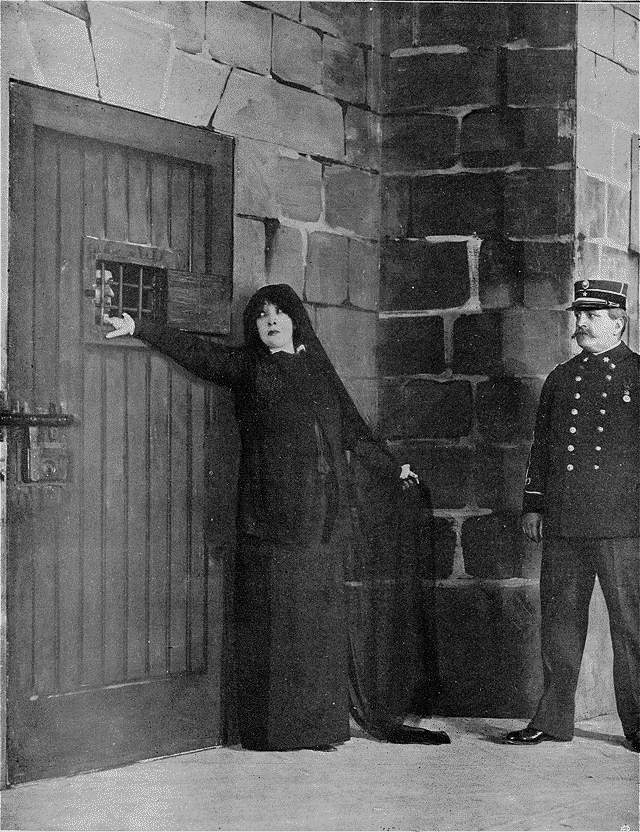 Jeanne Doré, portant déjà ses vêtements de deuil, devant le cachot de