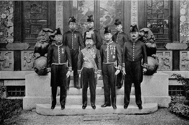 les membres de la Légation portant pour la première fois le costume des