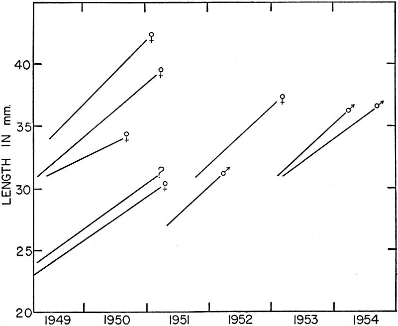 Frogs that metamorphose in late summer have little time to grow before hibernating, and still are small when they emerge in spring. The smallest one found was 19 mm. long (May 19, 1951), and in each year except 1954 many such young were found that were less than 25 mm. in length in May or early June. None of the frogs marked at or near metamorphosing size has been recaptured, but the trend of early growth is well shown by Table 2 and Fig. 3. However, many juveniles that were captured and marked within a few weeks of metamorphosis were recaptured as adults. The selected individuals in Table 3 are considered typical of growth from "half-grown" to small adult size. Growth in many other individuals is shown in Figs. 6 and 7.[Pg 293]