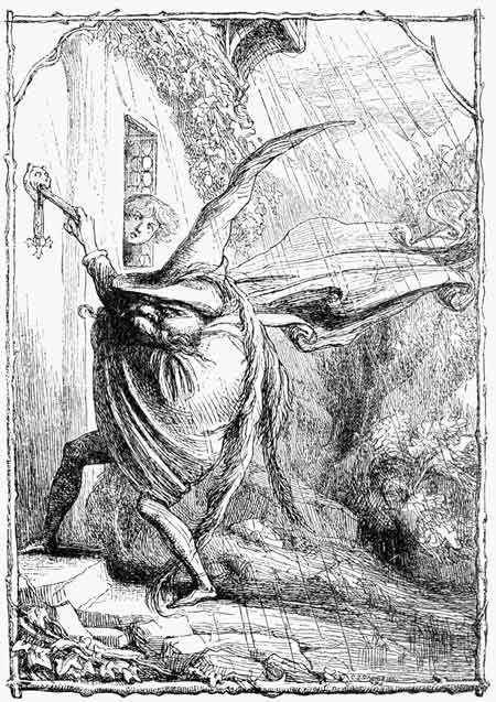 Gluck had had his head, by this time, so long out of the window, that he began to feel it was really unpleasantly cold, and when he turned, and saw the beautiful fire rustling and roaring, and throwing long bright tongues up the chimney, as if it were licking its chops at the savoury smell of the leg of mutton, his heart melted within him that it should be burning away for nothing. "He does look very wet," said little Gluck; "I'll just let him in for a quarter of an hour." Round he went to the door, and opened it; and as the little gentleman walked in, there came a gust of wind through the house, that made the old chimneys totter.