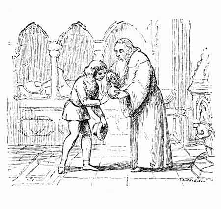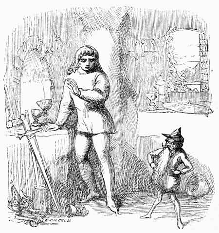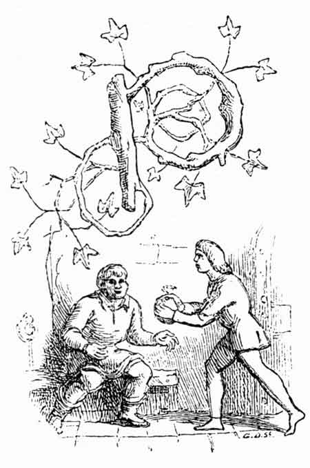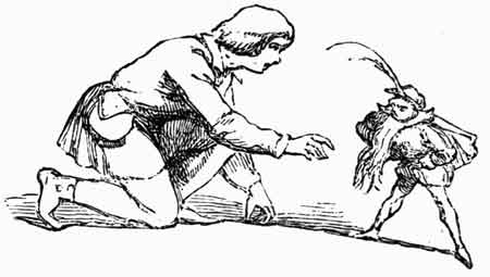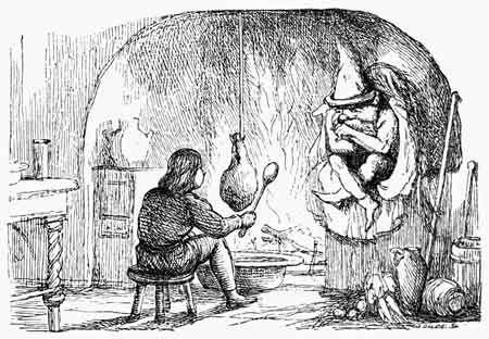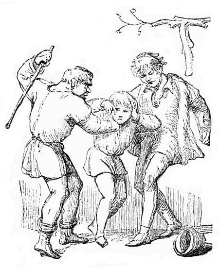 The youngest brother, Gluck, was as completely opposed, in both appearance and character, to his seniors as could possibly be imagined or desired. He was not above twelve years old, fair, blue-eyed, and kind in temper to every living thing. He did not, of course, agree particularly well with his brothers, or rather, they did not agree with him. He was usually appointed to the honourable office of turnspit, when there was anything to roast, which was not often; for, to do the brothers justice, they were hardly less sparing upon themselves than upon[Pg 12] other people. At other times he used to clean the shoes, floors, and sometimes the plates, occasionally getting what was left on them, by way of encouragement, and a wholesome quantity of dry blows, by way of education.