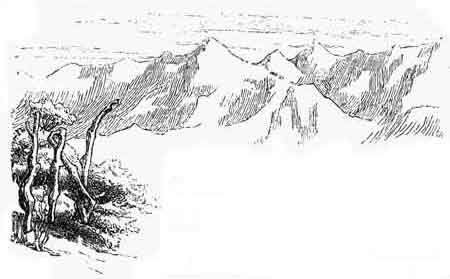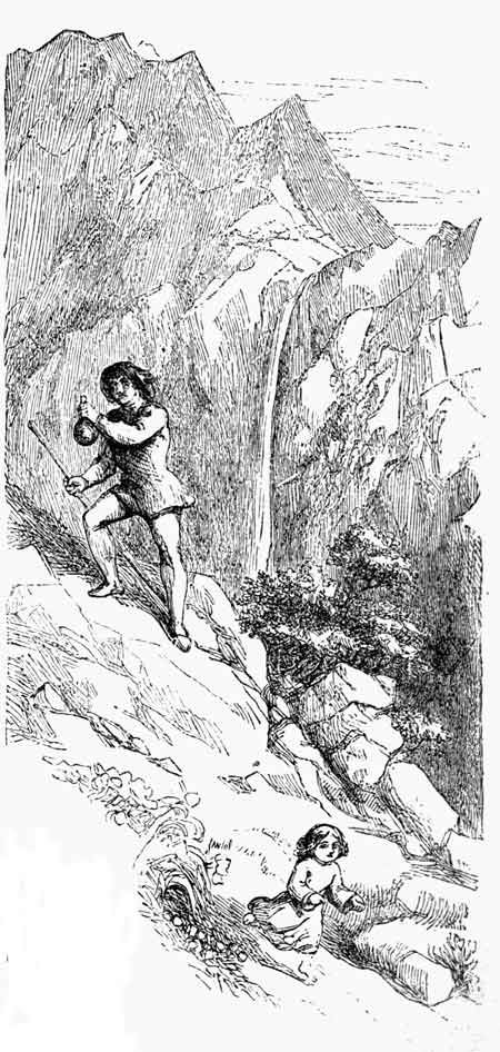 If the glacier had occasioned a great deal of fatigue to his brothers, it was twenty times worse for him, who[Pg 48] was neither so strong nor so practised on the mountains. He had several very bad falls, lost his basket and bread, and was very much frightened at the strange noises under the ice. He lay a long time to rest on the grass, after he had got over, and began to climb the hill just in the hottest part of the day. When he had climbed for an hour, he got dreadfully thirsty, and was going to drink like his brothers, when he saw an old man coming down the path above him, looking very feeble, and leaning on a staff. "My son," said the old man, "I am faint with thirst, give me some of that water." Then Gluck looked at him, and when he saw that he was pale and weary, he gave him the water; "Only pray don't drink it all," said Gluck. But the old man drank a great deal, and gave him back the bottle two-thirds empty. Then he bade him good speed, and Gluck went on again merrily. And[Pg 49] the path became easier to his feet, and two or three blades of grass appeared upon it, and some grasshoppers began singing on the bank beside it; and Gluck thought he had never heard such merry singing.