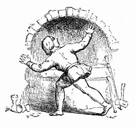 Then Gluck warmed a plate, and sharpened a knife. "I don't care if I do get beaten for it," thought he. Just as he had cut a large slice out of the mutton, there came a tremendous rap at the door. The old gentleman jumped off the hob, as if it had suddenly become inconveniently warm. Gluck fitted the slice[Pg 18] into the mutton again, with desperate efforts at exactitude, and ran to open the door.