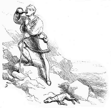 His way now lay straight up a ridge of bare red rocks, without a blade of grass to ease the foot, or a projecting angle to afford an inch of shade from the south sun. It was past noon, and the rays beat intensely upon the steep path, while the whole atmosphere was motionless, and penetrated with heat. Intense thirst was soon added to the bodily fatigue with which Hans was now afflicted; glance after[Pg 40] glance he cast on the flask of water which hung at his belt. "Three drops are enough," at last thought he; "I may, at least, cool my lips with it."