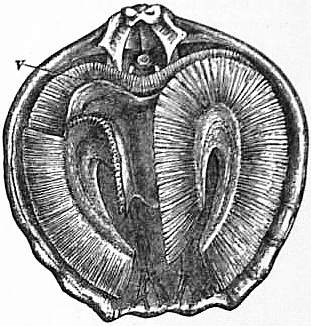 The body of the Brachiopod usually occupies about the posterior half of the space within the shell. The anterior half of this space is lined by the inner wall of the mantle and is called the mantle cavity. This cavity lodges the arms, which are curved and coiled in different ways in different genera. The water which bears the oxygen for respiration and the minute organisms upon which the Brachiopod feeds is swept into the mantle cavity by the action of the cilia which cover the arms, and the eggs and excreta pass out into the same cavity. The mouth lies in the centre of the anterior wall of the body. Its two lips fusing together at the corners of the mouth are prolonged into the so-called arms. These arms, which together form the lophophore, 362 may be, as in Cistella, applied flat to the inner surface of the dorsal mantle fold, but more usually they are raised free from the body like a pair of moustaches, and as they are usually far too long to lie straight in the mantle cavity, they are folded or coiled up. The brachial skeleton which in many cases supports the arms has been mentioned above.