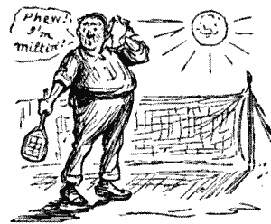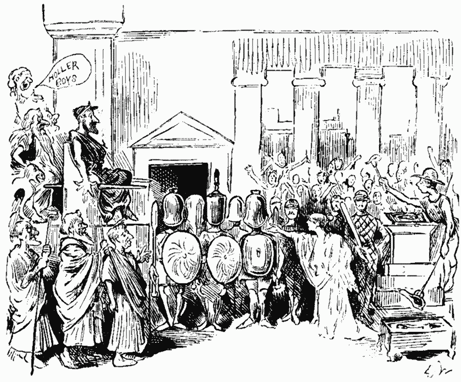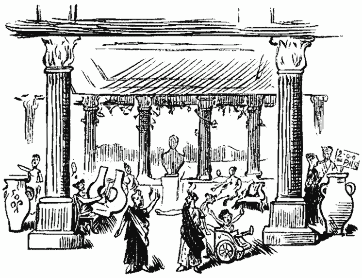 On the Sands.—Dense crowd. Deafening noise. Penny bagpipes, comb and paper. Italian girls with accordion, trumpet from sailing-boat. '"Ere y'are for a jolly sail out, Sir!"—which happens to be just the precise thing I am not here for. Nor (I should have thought) do I look the kind of person likely to buy that "strong and emusing toy, one penny, the little Chinese Bandalore"—but these fellows have no eye for character. Several shoeblacks very anxious to black my boots, which, as I tell them, would be "painting the lily." Don't think they understand me. Stop thoughtlessly to look at a cage containing a tree-frog and two Japanese rats. Proprietor approaches with plate: "This little Jubilee Menagerie open free to the Public," he says—"we ope the Public will respond by a similar liberality." Well, well, if I must—but it really was not worth a penny.