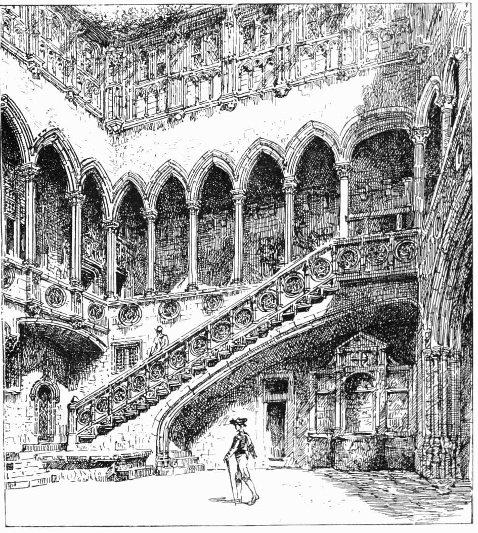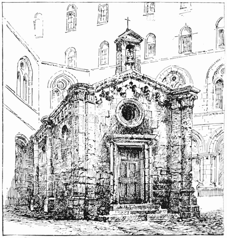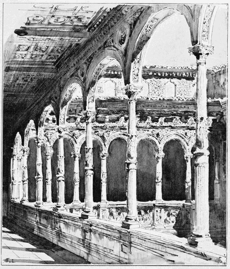 This dream-building was vanishing under the hands of the restorer. The court was filled with workmen, and the exquisite tone of age, the rounded, crumbling outlines were beginning to disappear. We were just in time to see it at its best.