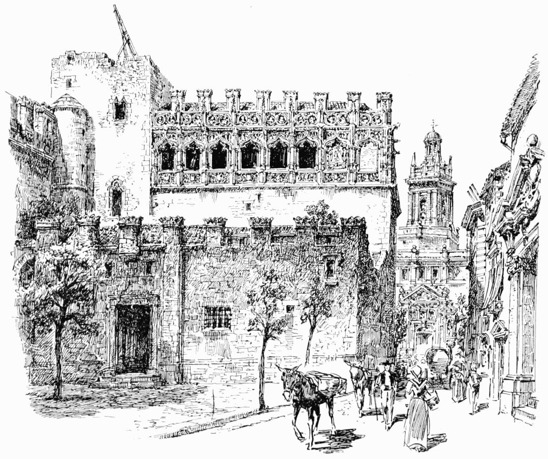 Next we come to the once vast and splendid Convent of San Domingo, in the days of its glory one of the richest and most powerful convents in Spain, but now shorn of all its ecclesiastical element. Outlines alone remain: the chapter-house and cloisters of late Gothic still beautiful and refined. In a small chapel supported by four slender pillars San Vincente Ferrer took upon him the vows of a monk.