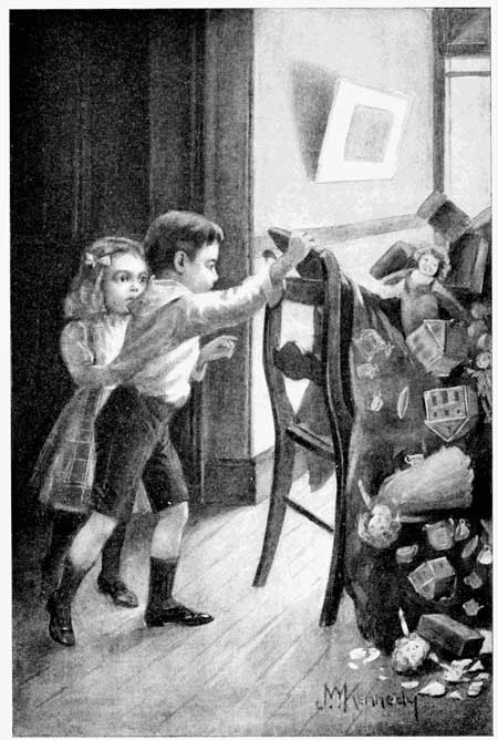 "Well, they took tea to their breakfast," said Sam. "Don't interrupt me, Dot. You are the audience, and you mustn't speak. Here you see the horses of the English ambassador out airing with his groom. There you see two peasants—no! they are not Noah and his wife, Dot, and if you go on talking I shall shut up. I say they are peasants peacefully driving cattle. At this moment a rumbling sound startles every one in the city"—here Sam rolled some croquet balls up and down in a box, but the dolls sat as quiet as before, and Dot alone was startled,—"this was succeeded by a slight shock"—here he shook the table, which upset some of the buildings belonging to the German farm.—"Some houses fell."—Dot began to look anxious.—"This shock was followed by several others.—" "Take care," she begged—"of increasing magnitude—" "Oh, Sam!" Dot shrieked, jumping up, "you're breaking the china!—" "The largest buildings shook to their foundations,—" [5]"Sam! Sam! the doll's house is falling," Dot cried, making wild efforts to save it: but Sam held her back with one arm, whilst with the other he began to pull at the boards which formed his table—"Suddenly the ground split and opened with a fearful yawn"—Dot's shrieks shamed the impassive dolls, as Sam jerked out the boards by a dexterous movement, and doll's house, brick buildings, the farm, the Swiss cottages, and the whole toy-stock of the nursery, sank together in ruins. Quite unabashed by the evident damage, Sam continued—"and in a moment the whole magnificent city of Lisbon was swallowed up. Dot! Dot! don't be a muff! What's the matter? It's splendid fun. Things must be broken sometime, and I'm sure it was exactly like the real thing. Dot! why don't you speak? Dot! my dear Dot! You don't care, do you? I didn't think you'd mind it so. It was such a splendid earthquake. Oh! try not to go on like that!"