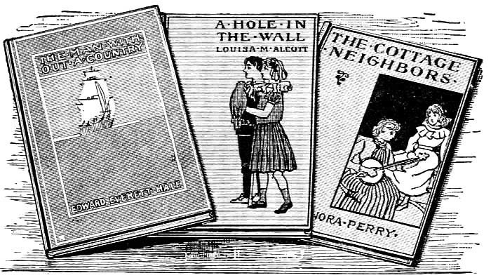 "Never mind," said Dot, "I don't care; and I've asked for a story, and we're going into the library." As Dot said this, she jerked her head expressively in the direction of the sofa, where Aunt Penelope was just casting on stitches preparatory to beginning a pair of her famous ribbed socks for Papa, whilst she gave to Mamma's conversation that sympathy, which (like her knitting-needles) was always at the service of her large circle of friends. Dot anxiously watched the bow on the top of her cap as it danced and nodded with the force of Mamma's observations. At last it gave a little chorus of jerks, as one should say, "Certainly, undoubtedly." And then the story came to an end, and Dot, who had been slowly creeping nearer, fairly took Aunt Penelope by the hand, and carried her off, knitting and all, to the library.[8]