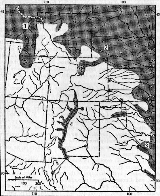 Fig. 1. Map of a part of the United States in the region of the Great Plains and Rocky Mountains, and adjacent northwestern Mexico showing supposed range (shaded) and localities of authenticated occurrence (dots) of Thamnophis sirtalis. 1. T. s. fitchi, 2. T. s. parietalis, 3. T. s. annectens, 4. T. s. ornata. Records from Idaho and Wyoming are based on specimens in the University of Kansas Museum of Natural History collection. Other records are based on Woodbury (1931) for Utah, Hudson (1942) for Nebraska, Maslin (1959) for Colorado, Smith (1956) for Kansas, R. G. Webb (MS) for Oklahoma, Brown (1950) and Fouquette and Lindsay (1955) for Texas, Cope (1900), Van Denburgh (1924), Little and Keller (1937) for New Mexico, and Smith and Taylor (1945) for Mexico.