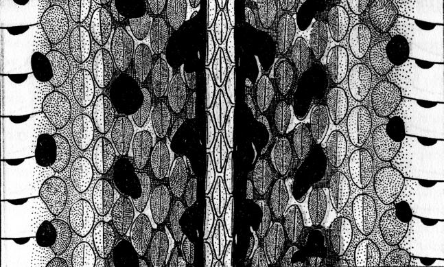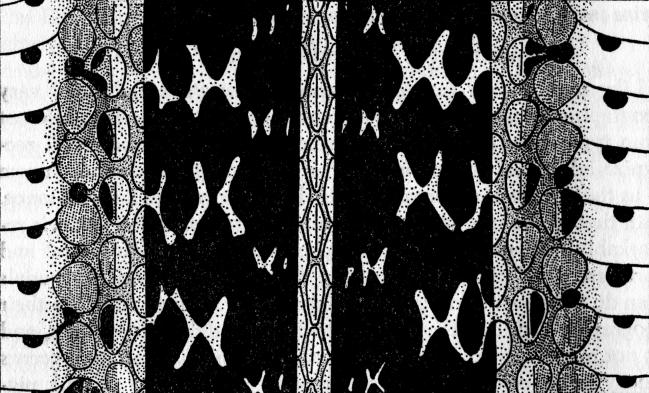 Forty-five specimens in the University of Colorado Museum from northwestern Colorado were subjected to pattern analysis. In three specimens the dorsolateral black area between the dorsal stripe and the lateral stripe on each side has no markings, and in eight others there is only an occasional fleck or crescent on the skin between the [pg 305] sixth and seventh scale rows. All others have the normal complement of dorsolateral crescents or flecks between the scales of rows three and four, four and five, and five and six. But, these specimens vary in extent of development of the crescents in the upper half of the dorsolateral area on each side—between scale rows six and seven, seven and eight, and eight and nine. Only six snakes show traces of the crescents of the uppermost series (between scale rows eight and nine). Development of these crescents is variable but in all the specimens the crescents are confined to the anterior half of the body. The crescents between rows six and seven and between seven and eight are present in 20 specimens and in ten of these the crescents are conspicuous and regularly arranged, often meeting and consequently form H-shaped markings. In most of the snakes the crescents are best developed in the second fifth of the body and disappear posteriorly. In five of the twenty, crescents between rows six and seven are fairly regular, but those between rows seven and eight are few and appear only sporadically. In eight specimens there are no crescents between either rows seven and eight or eight and nine. In eight others the crescents between rows six and seven are likewise absent, and only the crescents between rows three to six are present.