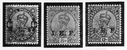 October, 1914. Stamps of India overprinted I.E.F. in seriffed type, for use with British troops on the Continent (Figs. 76-85). Perf. 14.