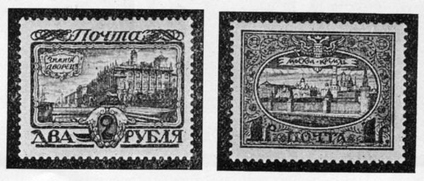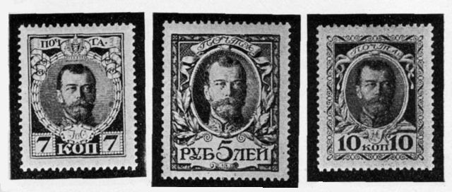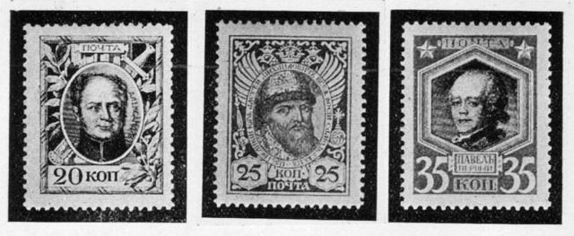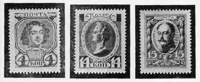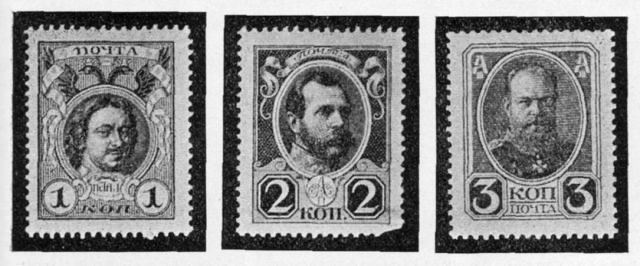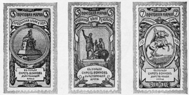 November 26, 1914. War Charity stamps. Surface-printed at the Russian Imperial State Printing Works on enamelled surface coloured papers (Figs. 189-192, see frontispiece). Sold for 1 kopec extra per stamp.