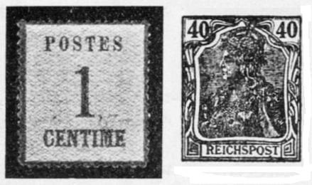 But the developments are already full of significance, and the stamps of each of the countries at war acquire a new interest in the occasions for their extra-territorial use as the armies invade the territories of their opponents. At the beginning of August the Germans invaded France and Belgium, accompanied, or followed shortly, by field postal organisations, of which few particulars are yet available. By the middle of August the French had entered Alsace and German Lorraine, and the Russians having invaded East Prussia set up posts there in which they used the current Russian stamps. The British Expeditionary Force, with its well-equipped Army Postal Service, was in France by the 16th. About this period the Germans invaded Cape Colony. The Tsar's promise of autonomy to Poland may ultimately demonstrate its fulfilment in the issue of new stamps for Poland. France issued its first Red Cross stamp, and similar war charity stamps have since appeared in Monaco, French Morocco, Russia, Austria, Hungary, and Bosnia. Japan's declaration of war, and successful attack on Kiaochow, probably led to the use of Japanese soldiers' stamps (Figs. 201, 202) by the forces engaged, possibly along with Indian stamps overprinted C.E.F. (China Expeditionary Force, Fig. 61), for the use of the co-operating British land forces. On the 26th the British along with the French took Togoland, and have already issued stamps of the Anglo-French occupation of that former German colony (Figs. 384-386). Prior to their issue the British Gold Coast stamps were used in Togo for a time (Fig. 370). Towards the end of the month the bombardment of[Pg 114] Malines destroyed the Belgian State Stamp-printing works, rendering it necessary to create an entirely new series of Belgian stamps when the Government finds itself in a position to do so. On the 29th Samoa was taken by the New Zealand forces, and English stamps have been used there (Fig. 371), and already a provisional and a definitive set of British Samoa stamps have appeared (Figs. 382, 383).