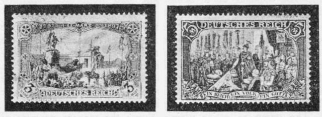 Egypt.—An event of the greatest interest to philatelists is the termination of the suzerainty of Turkey over Egypt, and the placing of the latter country under British protection. As a British protectorate, Egypt will be transferred to the British Empire division of the stamp catalogues, and a greatly increased interest will be taken in the postage stamps of the land of the Pharaohs, with the result that the earlier issues will rise appreciably in value. As recently as January 8, 1914, a handsome new series of stamps was issued in Egypt, on the anniversary day of the accession of the now deposed Khedive, Abbas II. These were not of a commemorative character, but were issued on the anniversary as a compliment to the then reigning Khedive. They probably call for no change in the designs under the new conditions, and as they are denominated in English the present stamps may be continued in use. But they will probably be changed in regard to the watermarked paper on which they are printed, as the watermarked device is that popularly known as the "star and crescent" (Fig. 387), although modern authorities appear to agree that the Turkish symbol is not a crescent (vide p. 87). The new Egyptian flag, under Sultan Hussein I., is red with three silver crescents each enclosing a star, instead of the Turkish flag with the single "crescent" and star. Thus although a new form of watermark may not be deemed necessary, a change to the "multiple" (or as printers term it, the "all-over") watermark of similar device would appropriately denote the new regime.