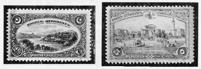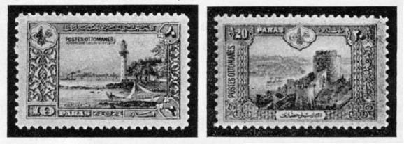 The following are illustrations of samples of the stamps which were in use at the British post-offices in Turkey at the time of the abolition of the Capitulations. (Figs. 18, 19).