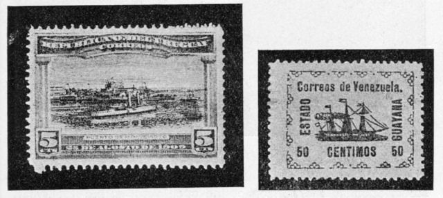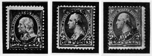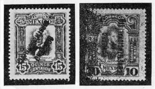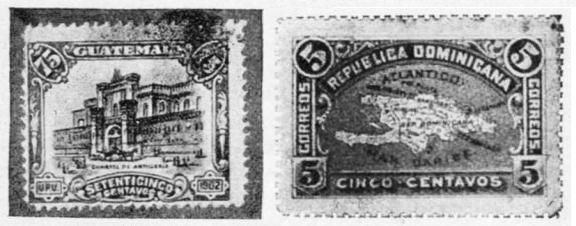 There were actually in Spain between the revolution of 1868 and the restoration of the house of Bourbon three different types of republic, the limited monarchy under Amadeus, and a military dictatorship. In 1872, too, the pretender Carlos proclaimed himself King of Spain, and issued the celebrated Carlist stamps from 1873 to 1875. So far as the general issues of Spanish stamps are concerned, their changes subsequent to the restoration of Alphonso XII., son of Isabella II., are free from further revolutionary changes, but there are postal war tax stamps of 1874-1879, and 1898 (Fig. 354).